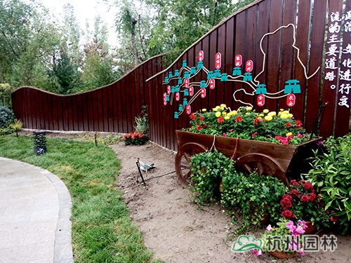 本处已有木制景墙做背景,花境施工前已在几个节点放置了花车、木桶等,并栽植了一棵较高大的红皮云杉,为花境营造创造了良好的条件。结合景墙上的文字、地图,以“陆上丝绸之路”文字为分界点,营造“丝•路”、“丝•念”两组花境。