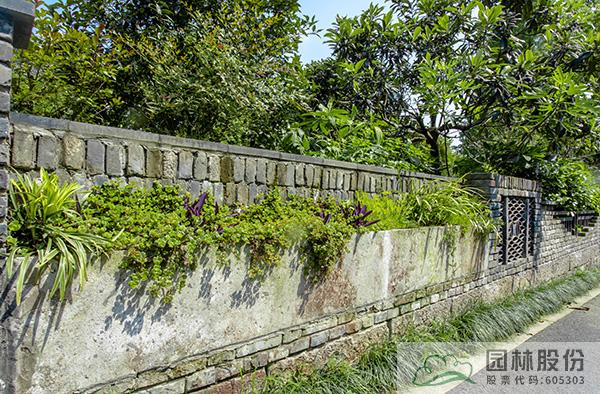 在杭州市余杭区径山镇小古城村项目中,我们应用了大量的文化景墙,这些景墙主要使用的是当地的乡土材料,营造出乡村质朴、素雅的氛围。作为小古城村特有的自然景观和人文风情,景墙表达了当地的特色文化,并且体现了自然神态,融入了历史文化。墙体的材料和形式不拘泥于传统的院墙,而是使用瓦片、栏杆、桐庐石、条石,以及青砖+瓦片、石雕+石鼓等丰富的乡土材料和堆砌形式。为使乡土风味的围墙与原本的小洋楼建筑相融合,项目运用了钢构框架、铝合金栏杆等元素作为过渡。此外,还有生态景墙的应用,将藤蔓植物进行合理种植,利用植物的抗污染、杀菌、降温等功能,形成既有生态效益、又有景观效果的绿色景墙。