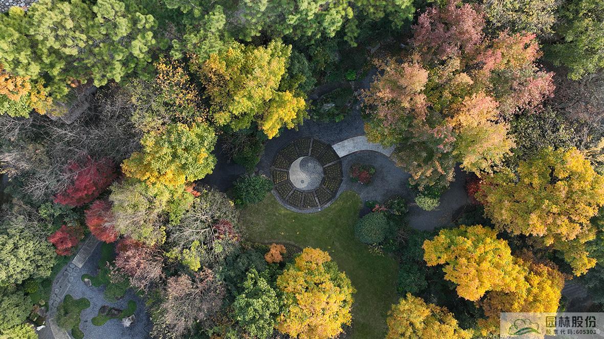 俯视画境园南园,枫香林在阳光中的色彩愈加斑驳,无患子绿色尚未全部褪去,金黄色树冠愈加油亮,尽显英式风景林的自然、洒脱。